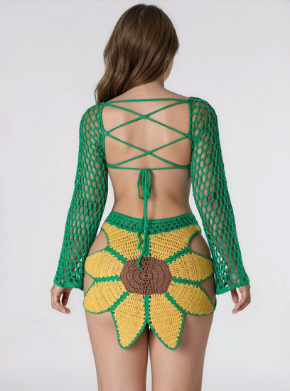 This sunflower knit skirt set will have you looking and feeling ready for a day in the sun. Crafted with a crochet knit, the skirt will show off your curves and make you look summer-ready. Let your natural beauty shine in this feminine and flattering ensemble.