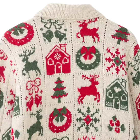 Elevate your festive wardrobe with this sophisticated holiday sweater featuring a refined collar and button-down front. The timeless beige base is beautifully accented with vibrant green and red holiday, Christmas, designs, striking the perfect balance between classic elegance and seasonal charm. Versatile enough for holiday gatherings or casual winter styling, this piece brings understated luxury to your seasonal rotation.
