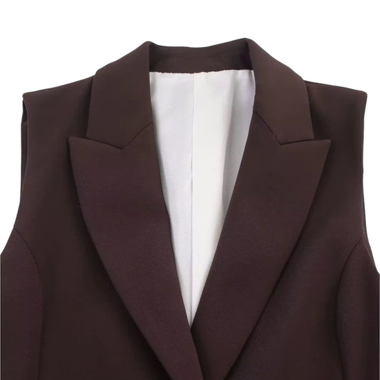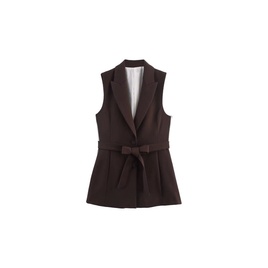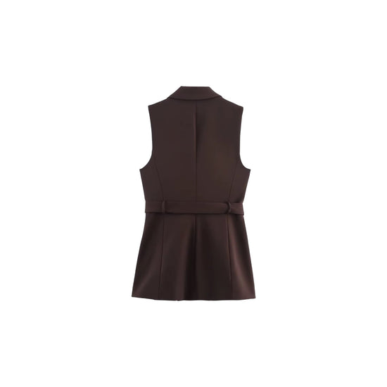 Our chic Kaela top is perfect for the professional woman to look her best this Fall. The sleeveless design and dark brown color add a touch of elegance, while the waist belt and collar provide a flattering silhouette. Look and feel confident in this versatile top.