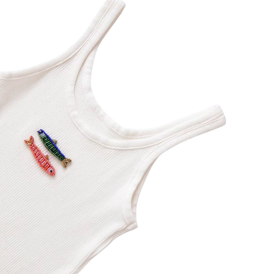 Introducing our Nerisse Top - a chic and stylish ribbed tank top in classic white. Adorned with a unique 3D beaded fish design, this top is sure to make a statement wherever you go. Elevate your wardrobe with this trendy piece and add a touch of playful sophistication to any outfit.