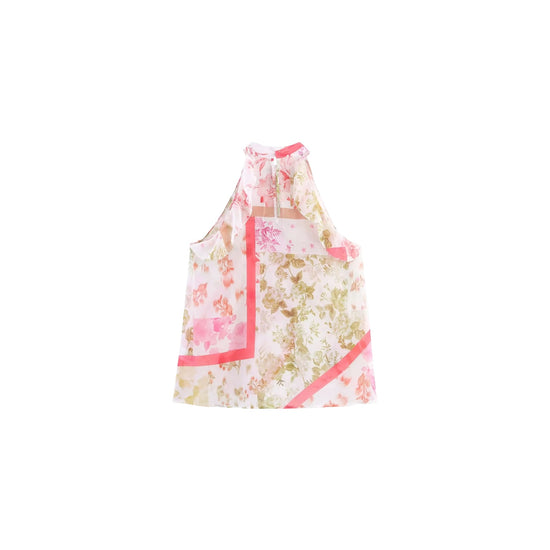 The Florisse Top is the perfect summer addition to your wardrobe. With a chic floral design in pink and green, this sleeveless top will keep you cool and stylish. Easily dress it up or down for any occasion.
