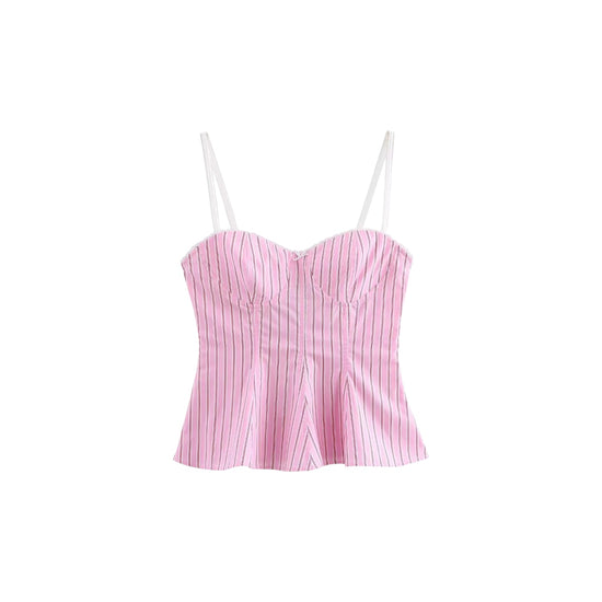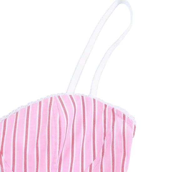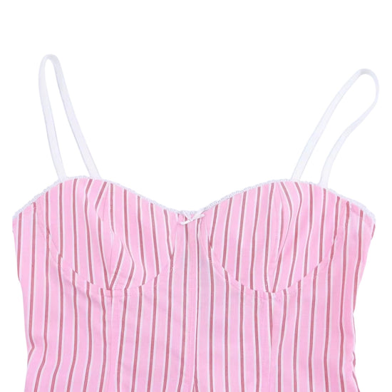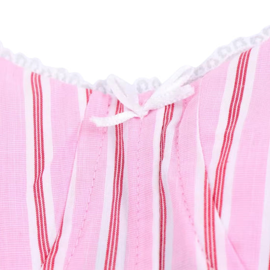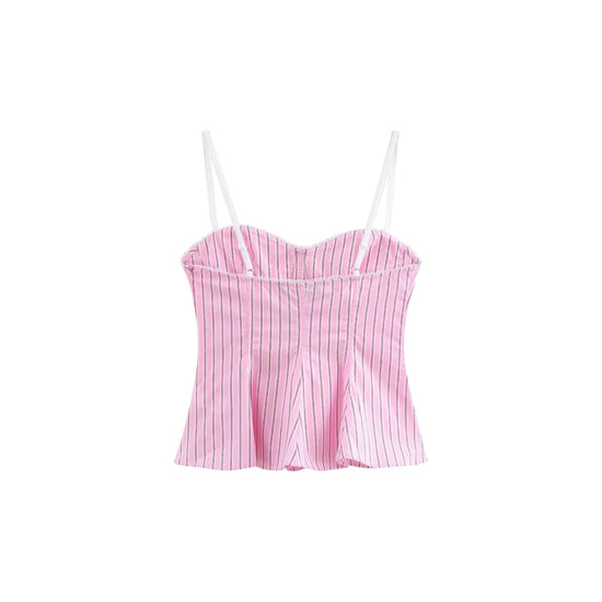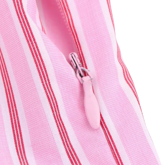 Be chic in our Melorra Top! The striped pink design and white trim with a small bow at the center top adds stylish details. The sleeveless cut is perfect for warmer days and the zipper adds convenience. Elevate your wardrobe with this trendy top.