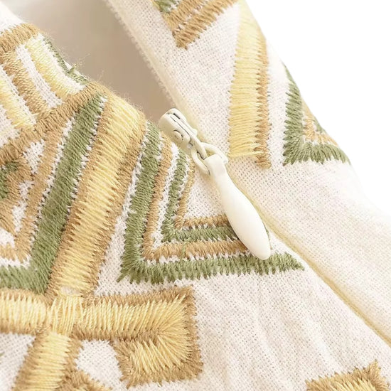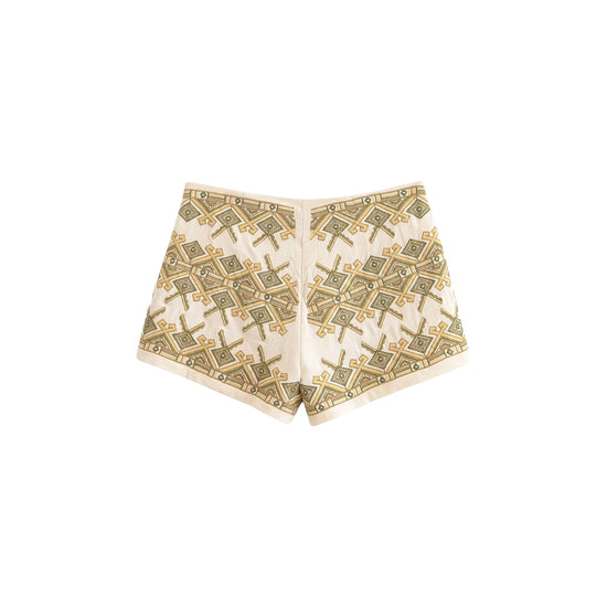 Elevate your summer wardrobe our Selora Shorts. Designed with a chic high waist, these shorts offer a flattering fit. The embroidered pattern in beige, green, and yellow adds a touch of sophistication to any outfit. Perfect for any occasion, these shorts are a must-have for the fashion-forward individual.
