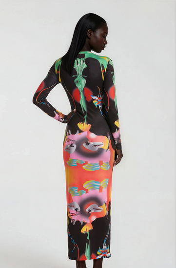 Experience luxury and elegance with the So Conceited Maxi Dress. This gorgeous piece is designed with long sleeves and a vibrant mix of black, orange, and green colors. Perfect for a night out or a special occasion, this dress will have you looking your best!