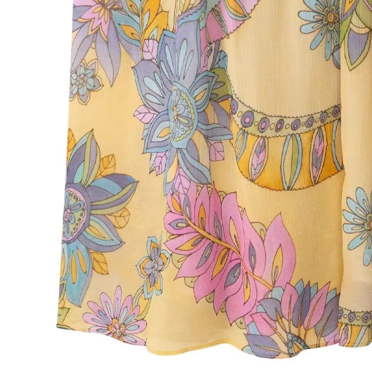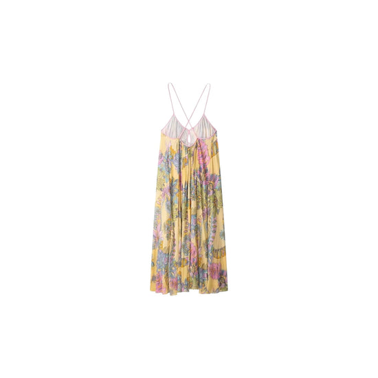 Effortlessly chic and feminine, our Nixie Dress is perfect for any summer occasion. The flowy, sleeveless design keeps you cool while the yellow, pink, and light blue print adds a playful touch. Complete the look with the delicate cross back thin straps and small chest keyhole.
