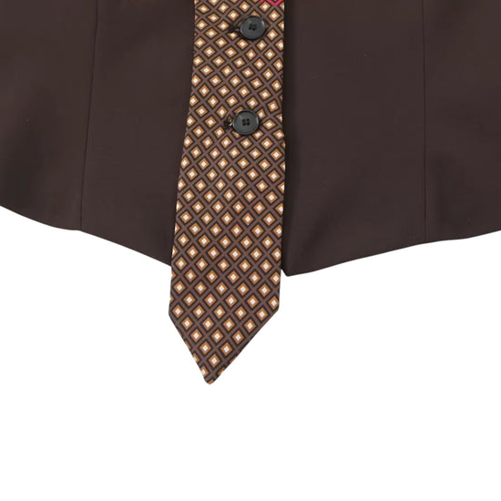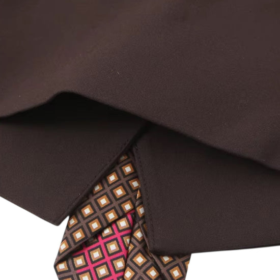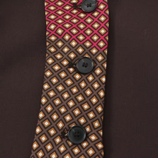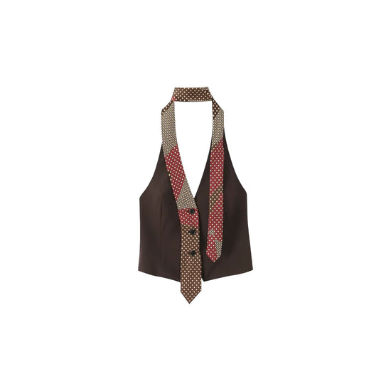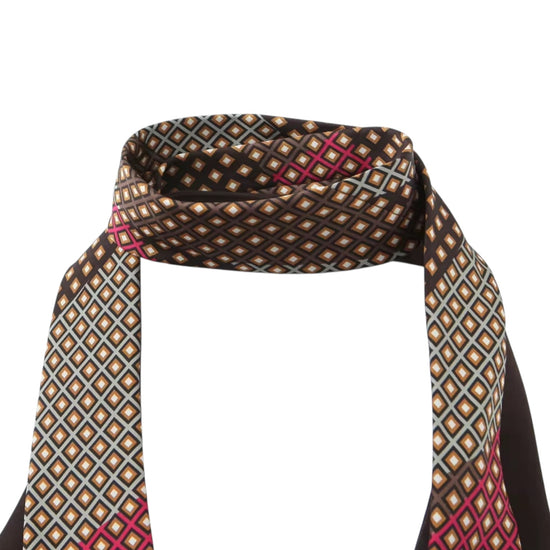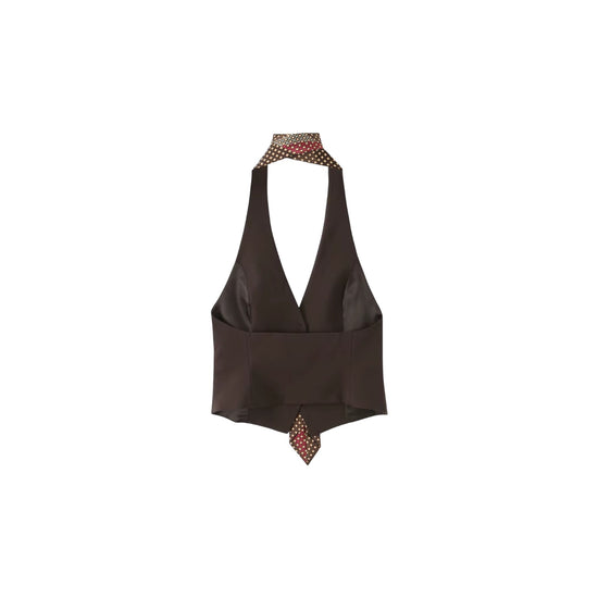 Add a touch of uniqueness to your wardrobe with our Chic Chessa Top. The dark brown sleeveless top features a stylish halter neck with a neck tie design in shades of red and brown, making it perfect for your Fall wardrobe. Stand out in style with the Chessa Top.