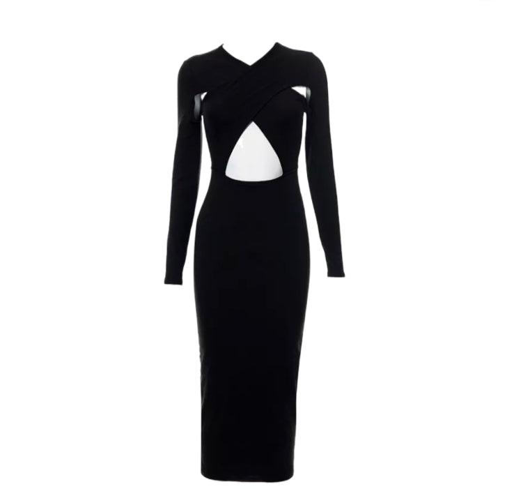 You'll stop traffic wearing this maxi dress, with long sleeves and an open cross-chest. Click "add to cart" to order now!