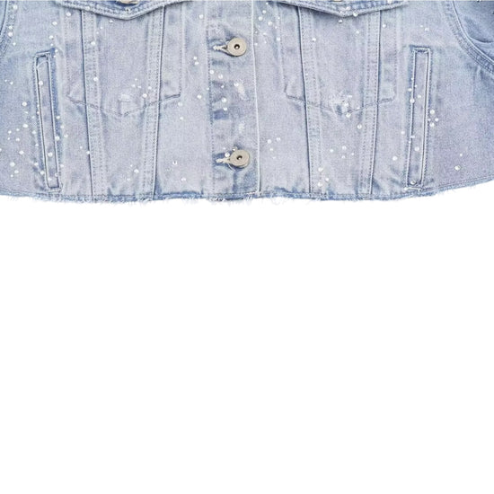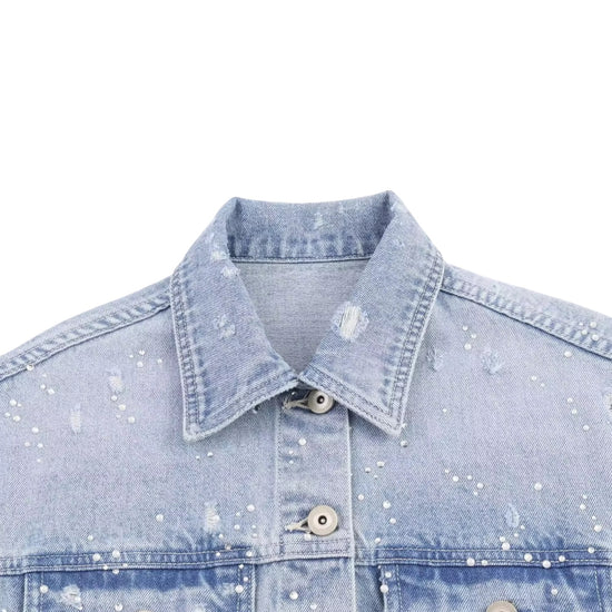 Introducing the chic and trendy Galira Jacket, with a short length for a stylish and flattering fit. Made from durable denim, this light wash jacket is adorned with rhinestones, adding a touch of glamour to any outfit. Perfect for the fashion-forward individual.