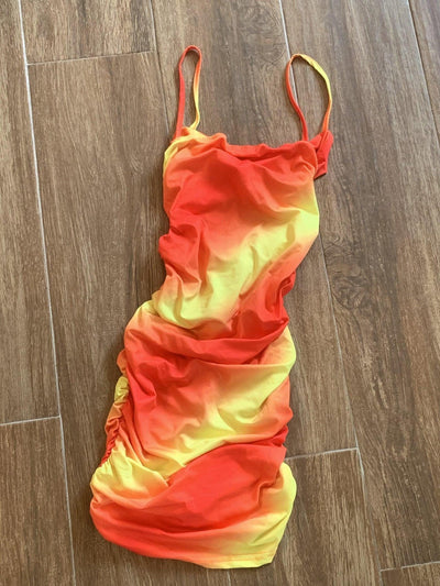 Donatella in our Mimosa Dress. This dress has beautiful vibrant orange and yellow colors in a gradient design. Made with Spandex and Polyester.