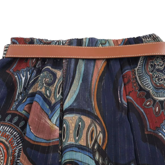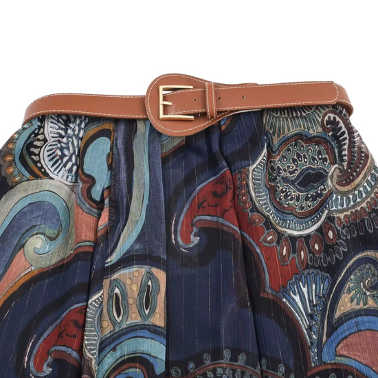 Elevate your style with our chic Valeen Skirt. This midi skirt features a unique abstract pattern in stunning shades of blue, brown, and orange. Complete with a flowy design and a belt accessory, this skirt effortlessly combines fashion and functionality. Add it to your wardrobe for a versatile and fashionable addition to any outfit.