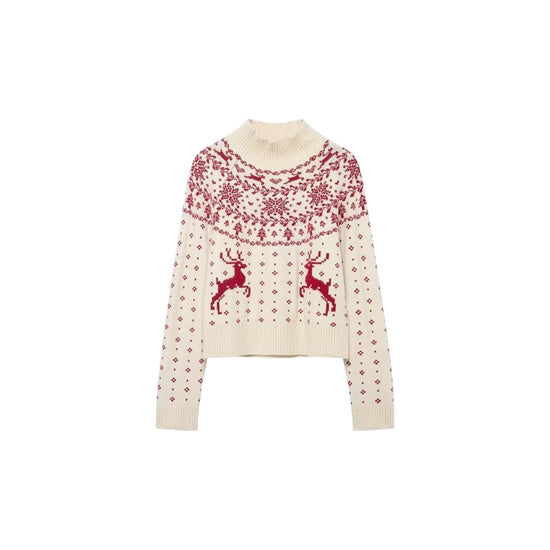 Embrace festive elegance with this chic reindeer sweater, featuring a charming reindeer design set against a sophisticated beige and red palette. Crafted from soft, cozy knit fabric, this pullover delivers warmth and style for holiday gatherings and winter days alike. The timeless color combination and playful motif make it a versatile addition to your seasonal wardrobe, perfect for creating effortlessly polished looks from casual outings to intimate celebrations.